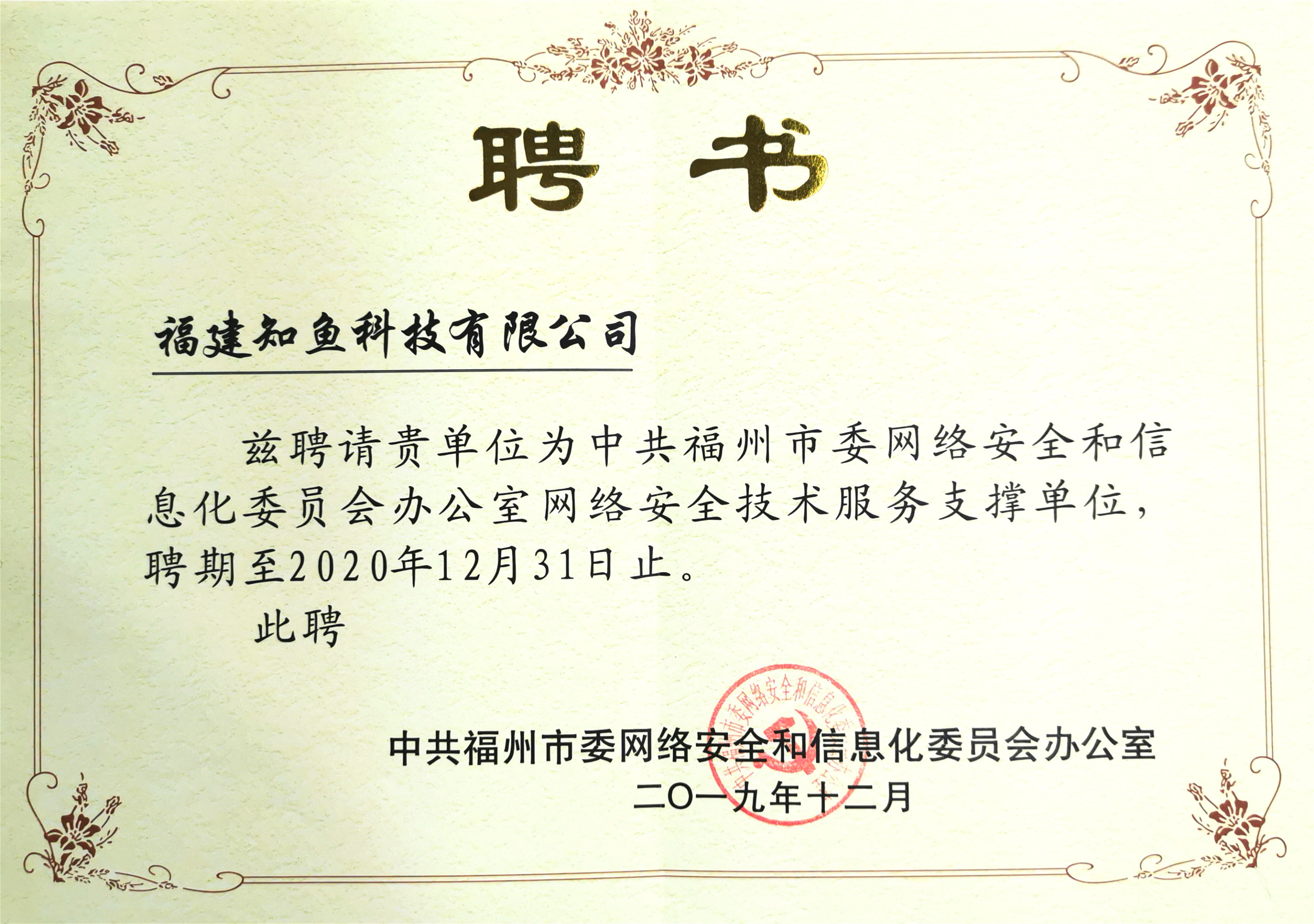 2019年12月,憑借網(wǎng)絡(luò)安全領(lǐng)域的技術(shù)優(yōu)勢(shì),知魚(yú)科技受聘為福州市委網(wǎng)信辦首批網(wǎng)絡(luò)安全技術(shù)支撐單位,為全市多領(lǐng)域提供網(wǎng)絡(luò)安全測(cè)評(píng)、網(wǎng)絡(luò)空間測(cè)繪、入侵檢測(cè)、安全防護(hù)等在內(nèi)的網(wǎng)絡(luò)安全綜合解決方案,為公共網(wǎng)絡(luò)安全保駕護(hù)航。
